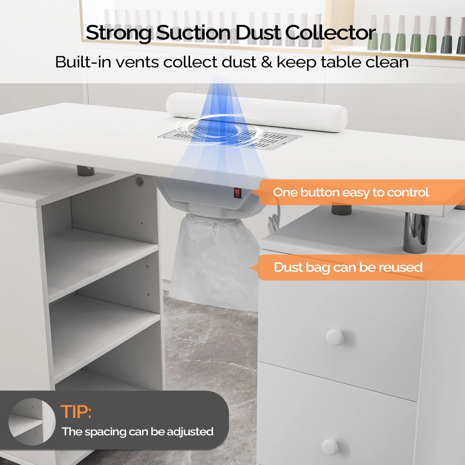 1.【Strong Electric Dust Collector】- Equipped with a powerful and efficient built-in electric dust collector. With just one button start and detachable dust bag, it can easily remove and collect nail shavings and dust generated during the manicure process, ensuring a clean and hygienic environment for both you and your customers.