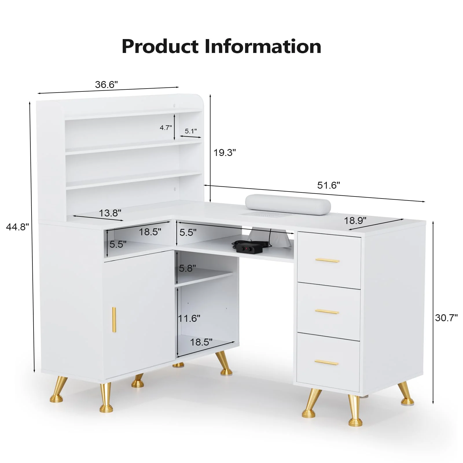 OmySalon MT-LS 52" L Shaped Nail Manicure Table w/Polish Display Rack & Electric Dust Collector & Wrist Rest