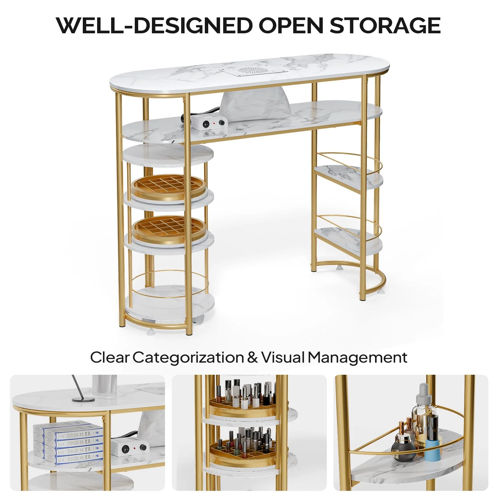 1.【Rolling Cart】- Utility trolley with a rotating divided tray for easy tool organization and quick access. Ideal for nail salons or DIY manicure enthusiasts. The rolling design allows for convenient movement around the workspace, enhancing mobility and usability.