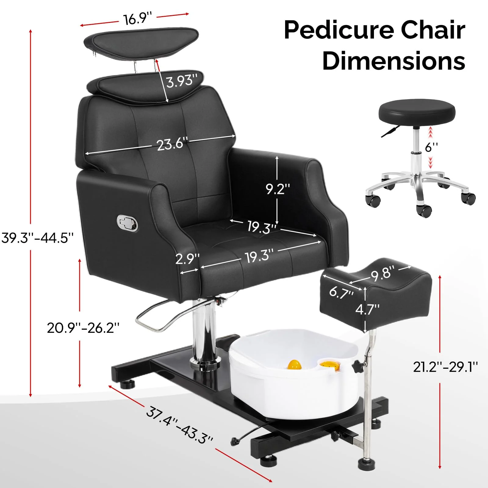 1.【High-Quality Construction】- The pedicure chair measures 37.4''-43.3'' x 23.6'' x 39.3''-44.5'' and features a sturdy metal base for superior stability and safety. It is made with high-quality waterproof and oil-resistant PVC leather, ensuring durability and long-lasting performance.