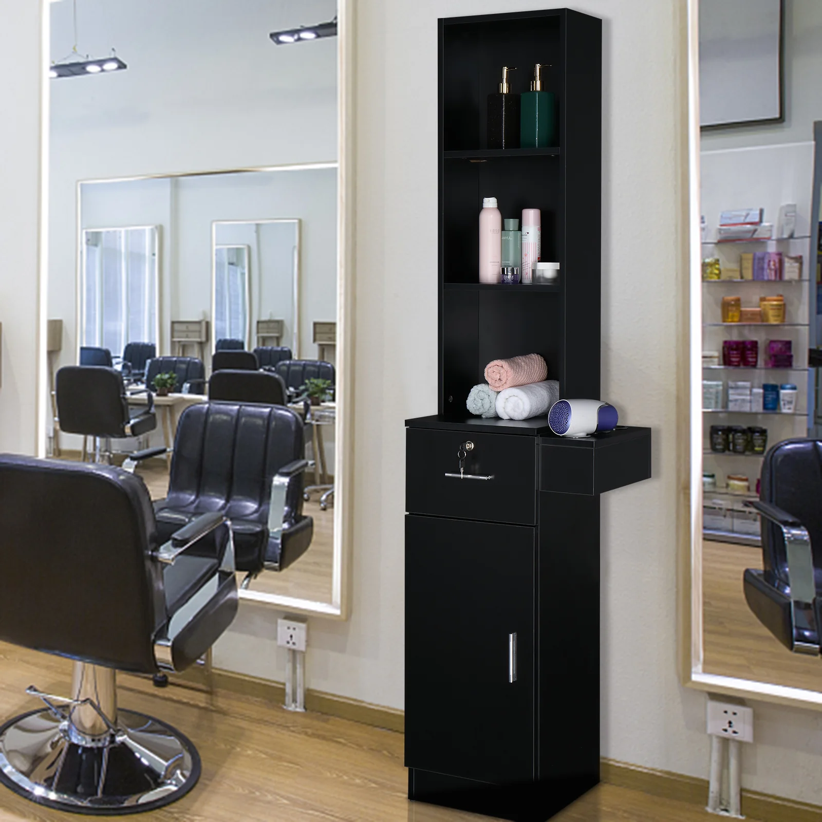 3.【Appropriate Size】- The size of this cabinet is 14.6"(L) x 13"(W) x 69.7"(H), making it compact and space-efficient. Its simple yet practical design makes it an ideal choice for barbershops.